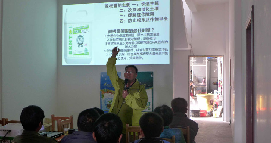 呂老師為果農們講解了根部用“微根露+美加健”兌水淋根/葉面用“海培+微果露”噴施的“二位一體”黃化防控技術,并展示了“二位一體”黃化防控技術在全國各地果園的成功案例,在場果農聽后表示信心滿滿,相信有了漢和“二位一體”套餐肥的幫助,今年黃化不再來。