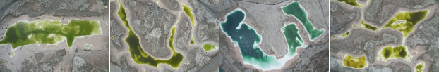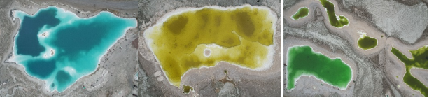 翡翠湖位于昆侖山腳下,由昆侖山融雪匯集鹽分,經年累月而成,由于其所含礦物質的種類不同,形成各個大小不一,顏色形態各異的鹽湖。科考隊員們第一次見到如此夢幻的景象,都非常激動和興奮。 由于游客較多,我們用無人機從空中俯瞰,選取了幾個具有典型特征且人跡稀少的區域取樣。