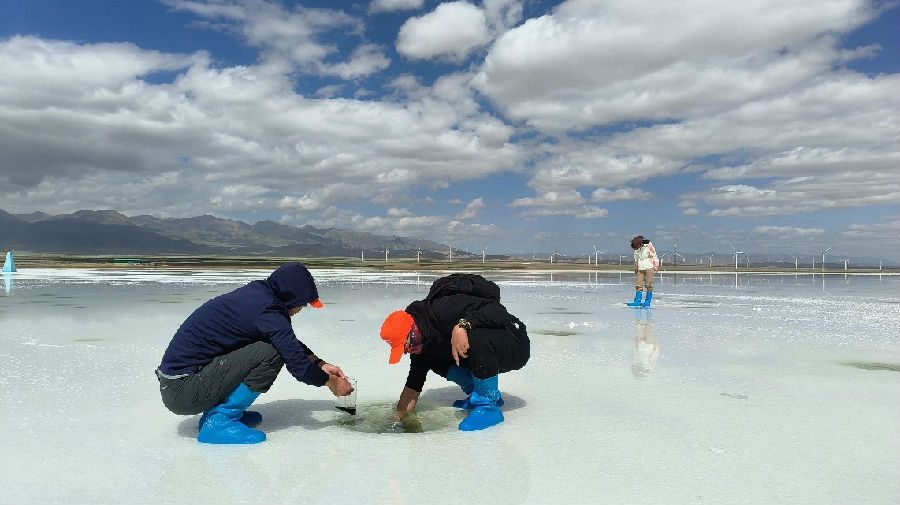 13日,科考隊員乘坐了5個小時的大巴,來到了茶卡鹽湖。茶卡鹽湖位于柴達木盆地烏蘭縣茶卡鎮,是中國四大鹽湖之一。進入茶卡鹽湖,由于湖上基本都有水,科考隊員們都穿上了水桶鞋,在鹽湖深處各鹽穴區域取樣。