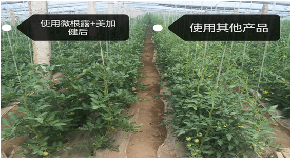 效果說明:試驗區莖干比對照區整體要更粗,說明使用微根露+菌劑后植株更加健壯。