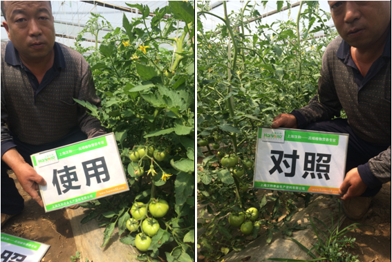 效果說明:相比對照,試驗區的番茄苗子明顯更加健壯、葉片更厚綠。