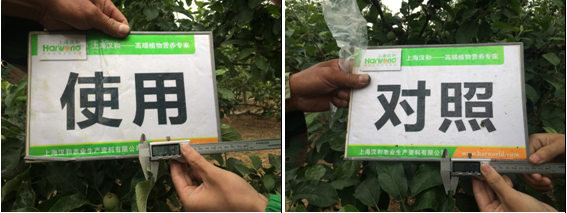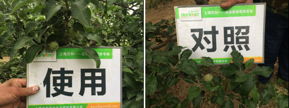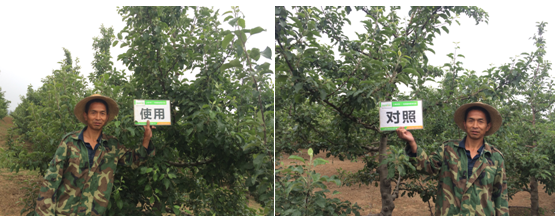 效果說明:通過對比可以看出實驗區相比對照區果實和葉片生長都更為健康,果個大,果型好,葉片舒展,深綠,葉面積大,并且表面有光澤。